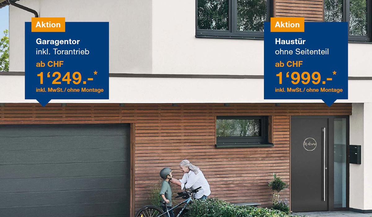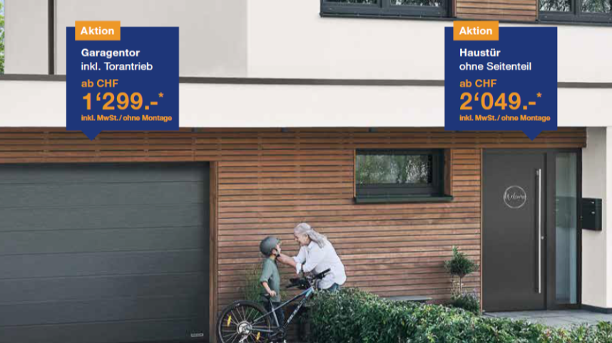 Vom 1. März bis zum 31. Dezember 2025 profitieren Sie von attraktiven Aktionspreisen für Garagentore, Haus- und Nebeneingangstüren, Zimmertüren aus Holz sowie Gerätehäuser und Gartenboxen als praktische Stauraumlösungen für den Aussenbereich.